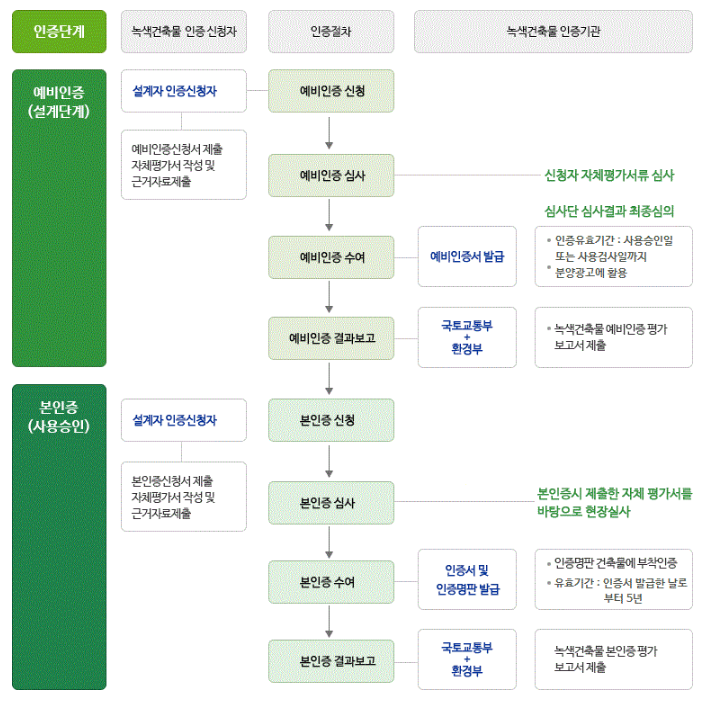 신청은 예비인증과 본인증으로 나뉘며, 예비인증은 사업계획승인 후(『건축법』 적용시에는 건축허가 및 신고 후)입니다. 본인증은 사용검사(『건축법』 적용 시는 사용승인) 이후입니다.