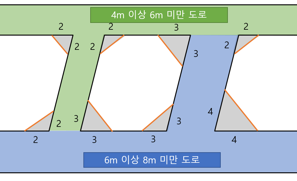도로 폭의 확보 외에도 건축선이 새롭게 지정되는 한 가지 요건이 또 있습니다. 바로 8m 미만 도로에 접한 대지 모서리에 적용되는 '가각전제'혹은 '가각정리'입니다. 도로 모퉁이의 가각정리에 의한 건축선 지정 기준은 '도로의 교차각'과 '교차되는 도로의 너비'에 따라서 달라집니다. 예를 들어 90도 이상의 각으로 만나는 4m와 6m 도로에 접하는 대지의 경우 아래 표에 따라 2m가 띄어야 하는 기준 거리가 되고, 각 모서리에서 2m씩 띈 점을 이은 선을 새로운 건축선으로 지정해야 합니다. 이렇게 새로 지정된 새로운 건축 지정선과 기존 건축선 사이 땅은 대지면적에서 제외됩니다. 이렇게 땅의 모서리를 깎는 이유는 도로의 교통흐름을 원활하게 하기 위함입니다. 따라서 가각정리는 건축법뿐만 아니라 도시계획적인 차원에서도 광범위하게 적용이 되고 있습니다. 도로가 8m 이상이고 교차하는 각이 120˚이상 도로가 만나는 경우에는 기준이 없는 이유가 교통적인 측면에서 보았을 때, 충분히 여유가 있어서 교통에 불리한 영향을 끼치지 않을 것으로 판단되기 때문입니다.