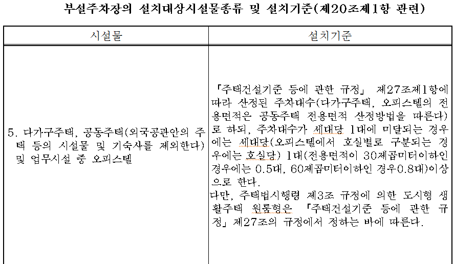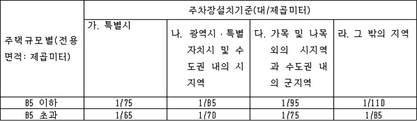 「주택건설기준 등에 관한 규정」제27조(주차장) ① 주택단지에는 다음 각 호의 기준(소수점 이하의 끝수는 이를 한 대로 본다)에 따라 주차장을 설치해야 한다. 1. 주택단지에는 주택의 전용면적의 합계를 기준으로 하여 다음 표에서 정하는 면적당 대수의 비율로 산정한 주차대수 이상의 주차장을 설치하되, 세대당 주차대수가 1대(세대당 전용면적이 60제곱미터 이하인 경우에는 0.7대) 이상이 되도록 해야 한다. 다만, 지역별 차량보유율 등을 고려하여 설치기준의 5분의 1(세대당 전용면적이 60제곱미터 이하인 경우에는 2분의 1)의 범위에서 특별시ㆍ광역시ㆍ특별자치시ㆍ특별자치도ㆍ시ㆍ군 또는 자치구의 조례로 강화하여 정할 수 있다. 2. 소형 주택은 제1호에도 불구하고 세대당 주차대수가 0.6대(세대당 전용면적이 30제곱미터 미만인 경우에는 0.5대) 이상이 되도록 주차장을 설치해야 한다. 다만, 지역별 차량보유율 등을 고려하여 다음 각 목의 구분에 따라 특별시ㆍ광역시ㆍ특별자치시ㆍ특별자치도ㆍ시ㆍ군 또는 자치구의 조례로 강화하거나 완화하여 정할 수 있다.