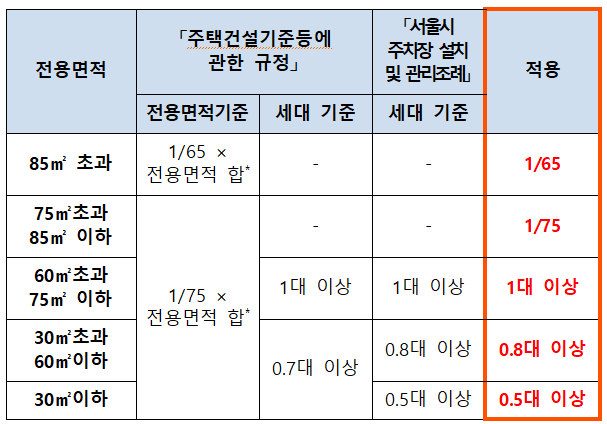 1. 전용면적 기준 : 전용면적의 합계를 기준으로 아래 표에서 정하는 면적당 대수의 비율로 산정한 주차대수
